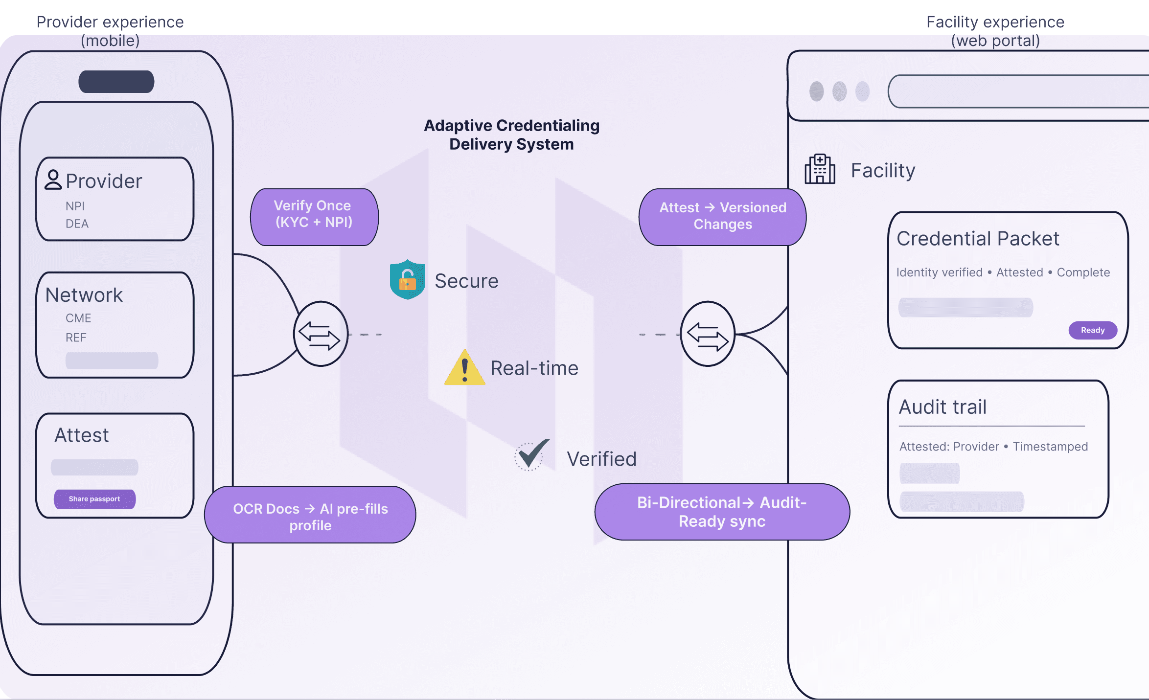 A provider-owned credential passport that’s identity-bound, verification ready, and continuously monitored with audit trails facilities can rely on.